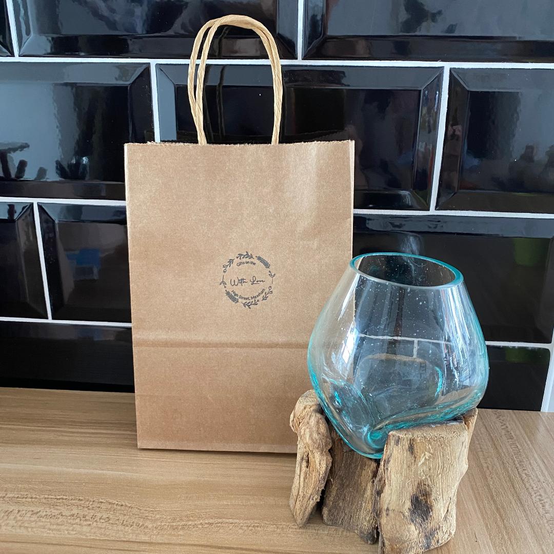 Molten glass bowl on wooden stand